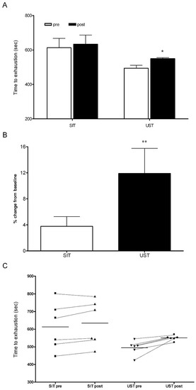 Absolute percentage and individual changes in time-to-exhaustion in SIT and UST groups. (A) Absolute changes pre-SIT and post-SIT and UST, * p < 0.05 pre-compared to post; (B) Percentage change from the baseline in SIT and UST groups, ** p < 0.05 SIT compared to UST; (C) Individual changes in time-to-exhaustion pre-SIT and post-SIT and UST.