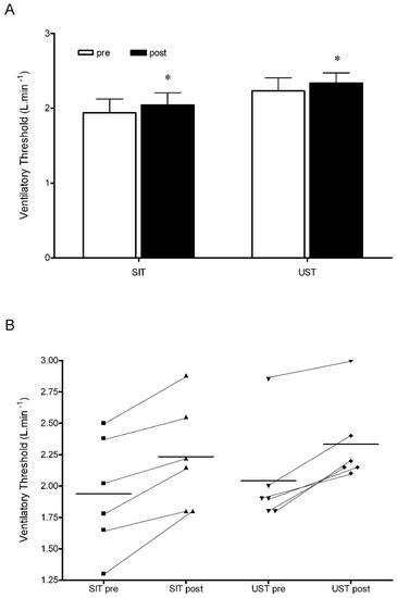 Absolute and individual changes in the ventilatory threshold in SIT and UST groups, (A) Ventilatory threshold pre-SIT and post-SIT and UST, * p < 0.05 pre compared to post; (B) Individual changes in ventilatory threshold pre-SIT and post-SIT and UST.
