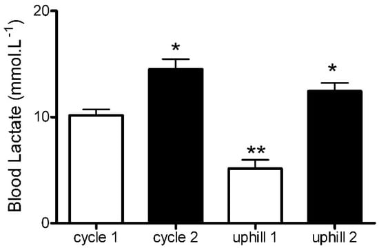 Blood lactate concentration following uphill run sprints and cycle sprints. * p < 0.01 sprint 1 compared to sprint 2. ** p < 0.001 cycle sprint 1 compared to uphill sprint 1.