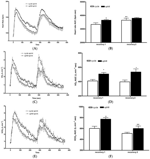 Changes in heart rate, VO2, and VCO2 during sprints and recovery. (A) Heart rate response; (B) Heart rate area under the curve, * p < 0.05 cycle sprint 1 compared to uphill sprint 1, ** p < 0.05 sprint 1 compared to sprint 2; (C) VO2 response. (D) VO2 area under the curve, * p < 0.05 sprint 1 compared to sprint 2; (E) VCO2 response; F: VCO2 area under the curve, * p < 0.001 cycle sprint 1 compared to uphill sprint 1, ** p < 0.001 sprint 1 compared to sprint 2.
