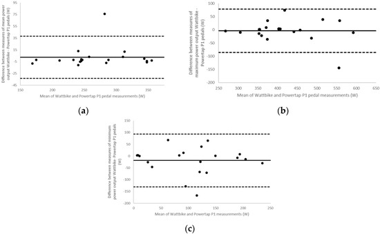 Bland-Altman plots for (a) mean power output (b) maximum power output and (c) minimum power output. Dashed lines represent the high and low 95% confidence intervals, the solid line shows the bias (the mean difference in power output reported between the two measurement methods).