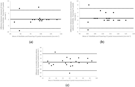 Limits of Agreement analyses resulted in values of: 2.35 ± 18.3 W (CI: 33.5 and 38.2) and an ICC of 0.973 for mean power output (Figure 1a); −3.95 ± 41.8 W (CI: 86.0 and 78.1) and an ICC of 0.944 for maximum power output (Figure 1b) and −18.65 ± 57.2 W (CI: 130.7 and 93.4) and an ICC of 0.816 for minimum power output (Figure 1c). Cadence analysis showed 0.25 ± 3.8 rev·min−1 (CI: 7.2 and 7.7) and an ICC of 0.864 for mean cadence (Figure 2a); 1.05 ± 2.6 rev·min−1 (CI: 4.1 and 6.2) and an ICC of 0.960 for maximum cadence (Figure 2b); and −1.00 ± 23.9 rev·min−1 (CI: 47.8 and 45.9) and an ICC of 0.619 for minimum cadence (Figure 2c).