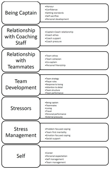 The data highlighted seven higher-order themes, which are used to form the basis of this discussion. These seven higher-order themes (Being captain; Relationship with coaching staff; Relationship with teammates; Team development; Stressors; Stress management; Self) have been identified from 33 lower-order themes (see Figure 1).