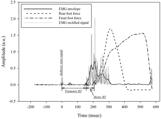 The rear foot Vastus Lateralis (VL) was the first muscle activated during the sprint start task, therefore premotor RT was determined as the time elapsed between the gunshot and the activation of the rear foot VL. Motor RT was determined as the time interval between rear foot VL activation and the initiation of force production (Figure 1).
