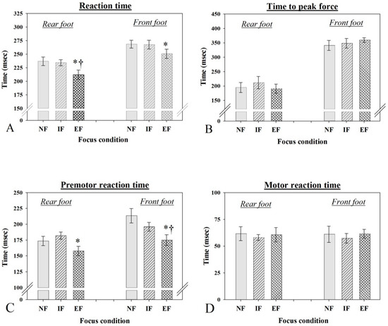 Mean duration under the no (NF), internal (IF) and external (EF) focus conditions for reaction time (A); time to peak force (B); pre-motor reaction time (C); and motor reaction time (D). Error bars represent standard error of the mean (SE). * Significantly less than IF (p < 0.05). † Significantly less than NF (p < 0.05).
