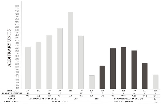 Our study occurred between SL at 16 m altitude at the Peruvian Altiplano (Puno, 3860 m altitude). The study period occurred from 23 November 2015 to 21 February 2016 (13 weeks; 91 days), and was composed of the athlete’s introductory cycle I (I1) (weeks 1 to 4) at SL, where training contents included arm ergometer workouts, over ground Nordic ski sessions and workouts below the first ventilatory threshold (<VT1) with the racing chair. Fundamental cycle I (F1) (weeks 5 and 6) occurred at SL where training included arm ergometer workouts, over ground Nordic ski, long moderate workouts at approximately VT1, two interval sessions at approximately VT2, and strength sessions in the gym. Introductory cycle 2 (I2) (weeks 7 and 8) occurred at SL week 7 and shifted to 3860 m altitude in week 8, where the athlete performed the same 16 to 20 km workouts <VT1 during the pre-altitude and acclimatization week. Fundamental cycle II (F2) (weeks 9 to 12) at 3860 m altitude, involved only intense sessions if the athlete reached a reference value of his Heart Rate Variability (HRV), considered as optimal to perform intense sessions, explained in detail previously [11]. The Introductory cycle 3 (I3) (week 13) occurred at SL, as post-altitude, and involved training identical to I2 (See Figure 1).