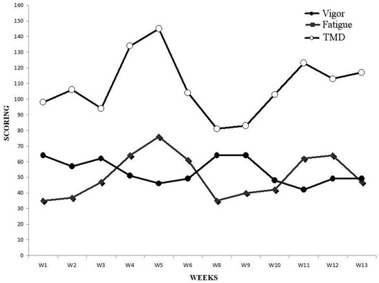 The Profile of Mood States questionnaire (POMS) [1] reflects the individual mood in six primary dimensions (Depression-Dejection, Tension-Anxiety, Anger-Hostility, Vigor-Activity, Fatigue-Inertia, Confusion-Bewilderment) and is widely used in sports to evaluate the psychological state of athletes. High values on the vigor-activity scale and low values in the remaining scales are desirable for athletic performance and resemble an iceberg formation when plotted. Exercise has been suggested to alter mood, depending on the type, volume, duration and intensity [2]. An optimal balance between training and rest may prevent overtraining symptoms, which have been characterized by fatigue, performance decrements, mood changes, irritability, and loss of motivation [3]. Moreover, during periods of overtraining, athletes generally report undesirable changes in Total Mood Disturbance (TMD), which represents the sum of the five negative scales of POMS, subtracting vigor score and adding a constant of 100 [4]. Therefore, flattened or even inverted iceberg profiles on the POMS subscales have been observed in non-functional, overreaching, or over trained athletes [5], as high values on the vigor-activity scale and low values in the remaining scales are desirable for athletics performance. Furthermore, when training load (TL) is reduced during taper periods, athletes have reported improvements in mood as reflected by a return of POMS scores to baseline. Moreover, it has been suggested that a 50% or greater increase in an individual’s basal off-season TMD score may be reflective of an overreaching state [6].