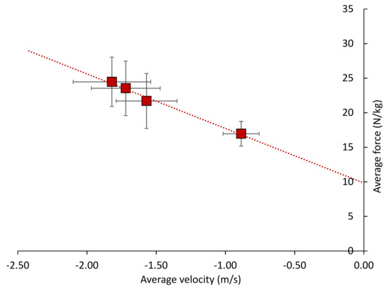 The average force during the propulsion phase of the JSs increased significantly as the external load increased (mean differences: 4.7 to 13.0 N/kg, p < 0.001) while the average vertical velocity (mean differences: −0.23 to −0.89 m/s, p < 0.001) and average power output (mean differences: −3.9 to −9.6 W/kg, p < 0.05) decreased significantly with the increasing load.