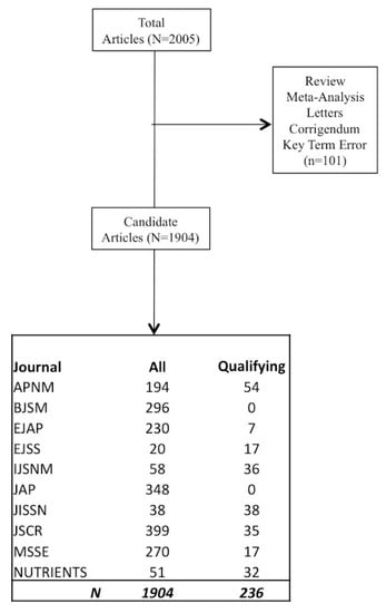 To perform our analysis, we examined articles from the year 2016 in order to examine a full year of reporting. Data collection was initiated in September of 2017 and concluded in March 2018. Initially, we ranked journals according to impact factor. Depending on the number of articles published within each journal, we further extended our search to include other journals demonstrating a propensity for publishing sports nutrition reports. We have presented a flow chart of the examined journals in Figure 1. All of these journals were available on PubMed and a full copy of each article was inspected for our proposed outcomes. Data was initially queried using the following key words: Diet, dietary, nutrition, supplement, carbohydrate, protein, placebo, fat, hydration, human, and clinical trial providing us with 2005 candidate articles. Subsequently, the candidate articles were then queried for terms such as review, meta-analysis, letter to the editor, etc. and eliminated if present. This provided us with 1904 potential articles. Finally, the remaining articles were examined one-by-one until the representative pool of 236 articles was established.