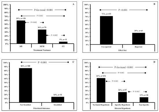 Data represent frequency (%, n) of (A) reported treatment variance; (B) reported effect size, (C) prioritized outcome stratification and (D) reported hypotheses.