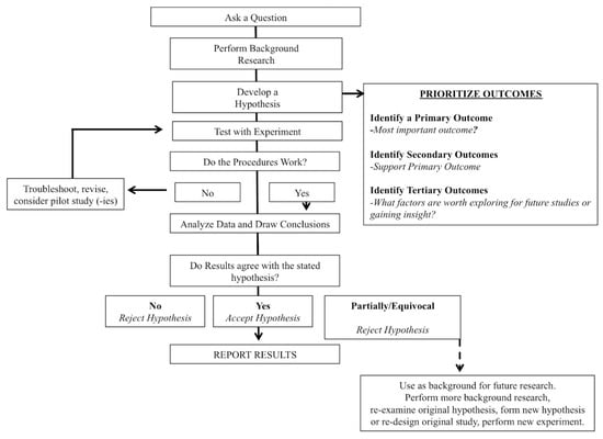 Why are hypotheses and stratified/prioritized analyses important? A common tenet of all scientific disciplines is (or should be) the scientific method (Figure 3). While some may feel that this assertion is pedantic, it is our opinion that the scientific method should be a cornerstone of sports nutrition and the exercise sciences; yet, we are also of the opinion that the scientific method is often overlooked or inadequately reported. As proposed by Darwin, the scientific method first consists of formulating, followed by the subsequent experimentation to test the hypothesis by empirical testing [17]. A central principle of the scientific methods is the collection of empirical data to test a hypothesis. Or, as put forth by Supino (2012), the hypothesis is a construct, interposed between a problem and its solution, which represents a proposed answer to a specific research question [18]. Farrugia (2010) further suggests that the research question should be developed before the start of the study and the primary objective of the study should be coupled (i.e., directed) to the hypothesis in order to communicate the clinical relevance of the trial [19]. Clark (2011) echoes these sentiments and goes further to state that very few papers formally reject or accept their hypothesis in the discussion, which, when done, shows a true understanding of research [20]. Anecdotally, within our roles as reviewers and editors, we have observed that it is not uncommon to formulate hypotheses after submission and review. This ex post facto practice is clearly not a valid method and should be avoided. We also observed that many papers stated an “aim,” but the aim was usually non-specific. What’s wrong with an aim?