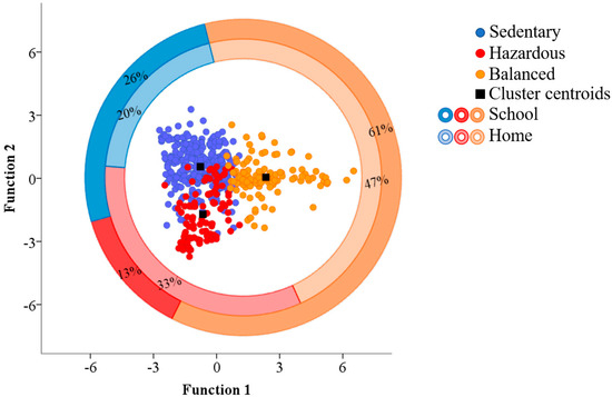 The discriminant analysis revealed that two functions can explain all the variance contained in the dataset. The first and second functions hold 70.4% and 29.6% of the total variance explained, respectively, with statistically significant Wilks’ lambda (0.21 and 0.58 for Functions 1 and 2, respectively, p < 0.001). Vigorous PA, steps counts, energy expenditure, standing, moderate PA and MET had the highest correlation with the first function, while lying, SED breaks, sitting and light PA had highest correlation to the second function (Table 1). The scores of the two discriminant functions as function of the cluster groups and the concomitant centroids are shown in Figure 1. A total of 88.7% of original grouped cases were correctly classified with the two discriminant functions obtained. Sedentary group had 94.6% of the cases grouped accordingly, while Hazardous had 69.3% and Balanced had 90.2%. Figure 1 also represents the percentage of the category schedule (home/school) in describing the groups.