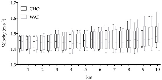 Median and interquartile ranges of the velocity (m.s−1) maintained during each km in the CHO and WAT trials. Boxplot lower and upper whiskers represent the minimum and maximum value, respectively.