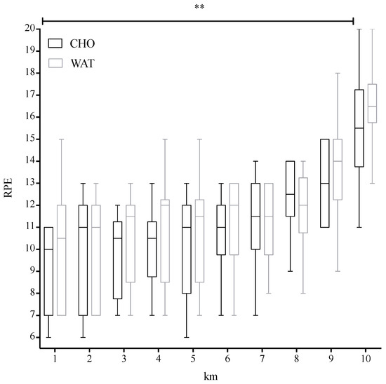 Median and interquartile ranges of RPE reported during each km in the CHO and WAT trials. Boxplot lower and upper whiskers represent the minimum and maximum value, respectively. ** p < 0.001.