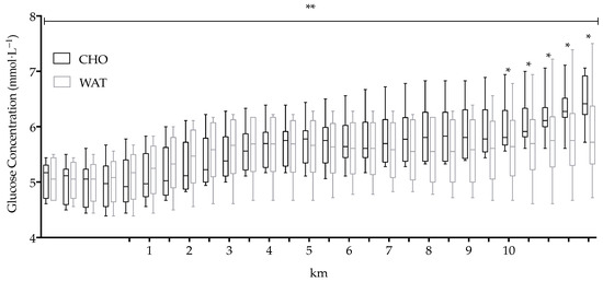 Median and interquartile ranges of glucose concentration (mmol·L−1) during each km in the CHO and WAT trials. Boxplot lower and upper whiskers represent the minimum and maximum value, respectively. * p < 0.05; ** p < 0.001.