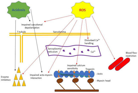 A simplified scheme of the purported effects of acidosis and reactive oxygen species (ROS) based on muscle fatigue literature reviewed in this article. Acidosis has been shown to cause impaired Ca2+ handling [55] and inhibition of key metabolic enzyme activities [57] as well as to inhibit myosin ATPase [56] affecting force and velocity of contraction [10]. ROS have been shown to cause: impaired sarcolemma ability to depolarize [87], disturbance in calcium release from the sarcoplasmic reticulum and decreased calcium sensitivity of the myofilaments [89], impaired acto-myosin interaction [91], enzyme inhibition [92] and blood flow restriction [93].