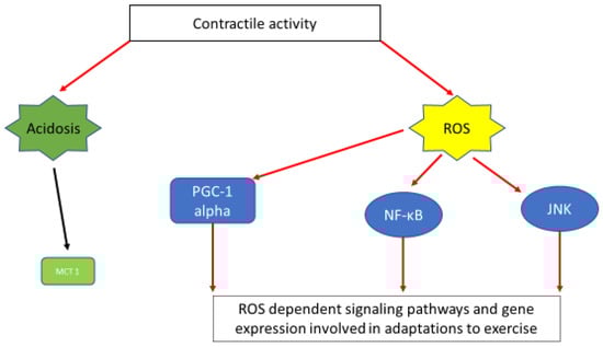 A simplified scheme depicting muscle contraction linked signaling pathways and gene expression induced via acidosis and ROS generation. Exercise-induced acidosis has been linked with induction of MCT1 expression [62]. Activation of important signaling pathways and gene expression connected with exercise adaptations, namely; PGC1a [99], NF-κΒ [97], JNK [98] are ROS dependent.