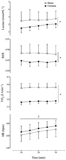 Time course of physiological variables during the MLSS running trial. Values reported are means ± SD. * Significant difference (p < 0.05) between males and females. † Significant change (p < 0.05) over time.