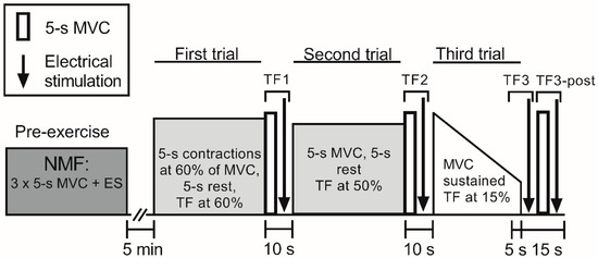 Diagram showing the protocol for the three trials. Neuromuscular function (NMF) (consisting of a 5-s maximal voluntary contraction (MVC)) followed immediately (<2 s) by electrical stimulation (ES) was assessed three times prior to the first trial, after every set during the first and second trials, and at task failure. First and second trials consisted of consecutive sets of 10 × 5-s isometric contractions followed by 5-s rest between contractions. In the first trial, the first nine contractions were performed at a target force set at 60% of the pre-exercise MVC, while the 10th contraction in each set was an MVC. Sets of contractions were repeated until task failure. In the second trial, sets of 10 × 5-s MVCs followed by 5-s rest between MVCs were performed until voluntary force dropped below 50% MVC. The third trial was a sustained MVC performed until force dropped below 15% MVC. Task failure of the first trial (TF1) and task failure of the second trial (TF2) comprised of a 5-s MVC followed by ES. Task failure of the third trial (TF3) comprised of the final 5 s of the third trial and the following ES. 5–10 s after the end of the third trial (TF3-post) comprised a 5-s MVC followed by ES. TF3-post started 5 s after cessation of the third trial.