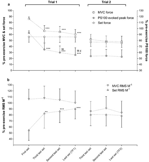 Responses in % of pre-exercise maximal voluntary contraction (MVC) force, set force, and evoked peak force for paired stimuli at 100 Hz (PS100) (panel (a)), and root mean square divided by M-wave peak to peak amplitude (RMS∙M−1) for MVC and set (panel (b)) of the first, third last, second last and the last set (TF1) for the first trial, and of the third last, second last and the last set (TF2) for the second trial. Data are means ± SD. Significant difference during the same trial, from first set: ** p < 0.01 and *** p < 0.001; from third last set: $$ p < 0.01; from second last set: £ p < 0.05.