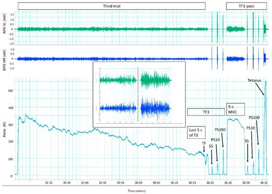 Responses in % of pre-exercise root mean square (RMS) for vastus lateralis (VL) and vastus medialis (VM), and force during the third trial (T3), task failure of the third trial (TF3) and TF3-post from one representative subject. Inserted is RMS for VL and VM during the last 5 s of T3 and the 5-s MVC of T3-post. T3 started more than 35 min into the protocol, and lasted approximately 52 s. Evoked responses of the single stimulus (SS), paired stimuli at 10 Hz (PS10), and paired stimuli at 100 Hz (PS100) were measured immediately the third trial and after a 5-s MVC. In addition, tetanus followed 1.5 s after PS100 during TF3-post.