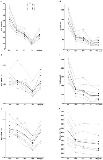 MVC force was lower (p < 0.001) at TF2 compared with TF1 and at TF3 compared with TF2 (Figure 4 and Table 1). MVC RMS∙M−1 was lower (p < 0.01) at TF3 compared with TF2 (Figure 4 and Table 1). Evoked peak forces for SS, PS10, PS100 and tetanus were lower (p < 0.05) at TF3 or TF3-post compared with both TF1 and TF2 (Table 1 and Figure 4). PS10∙PS100−1 ratio was lower (p < 0.01) at TF2 compared with TF1, and at TF3 compared with TF2 and TF1 (Table 1).