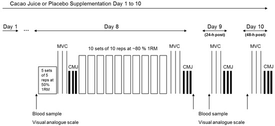 Participants were instructed to take one 330 mL serving of their supplement (described below) each morning. However, on day 8 (i.e., the day on which intense knee extension exercise protocol was performed), participants were advised to consume the juice immediately following the intense knee extension exercise protocol. In addition, 24-h and 48-h after the intense knee extension exercise protocol (i.e., day 9 and 10), participants ingested the supplement 60 min before arrival to the laboratory. Previous research has demonstrated that plasma anthocyanin bioavailability increases to a peak between 1–2 h post ingestion [