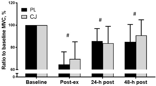 Across all trials, knee extension MVC decreased to a mean of 67% of baseline levels following the intensive exercise protocol (PL: 64.7 ± 11.3 vs. CJ: 69.6 ± 15.4%, d = 0.368) demonstrating a significant main effect of time (F