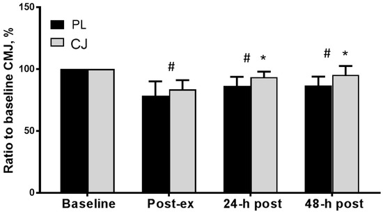2 = 0.093) with levels returning to 83.7 ± 15.2% in the CJ trial (vs. 85.7 ± 11.2%, placebo trial, d = 0.052) after 24 h post recovery and to 90.8 ± 14.0% in the CJ trial (vs 85.1 ± 15.6%, placebo trial, d = 0.391) after 48 h post recovery, respectively (