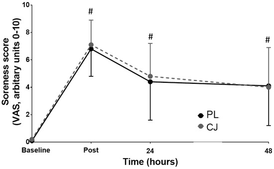 At each time point, fasting venous blood samples were collected into 10 mL vacutainers with one containing a gel for serum separation and one heparin coated. Heparinized samples were immediately centrifuged at 4500 rpm for 10 min at 4 °C before having the plasma removed and stored in eppendorfs. Samples containing no anti-coagulant were left at room temperature for one hour and then centrifuged at 4500 rpm for 15 min at 4 °C. Eppendorfs were then immediately stored at −80 °C and later analyzed for serum creatine kinase (marker of muscle damage), serum protein carbonyls (marker of oxidative damage), and a C–reactive protein (hsCRP) and interleukin 6 (IL-6, markers of inflammation) by using a high sensitivity enzyme-linked immunosorbent assay (R&D Systems®, Minneapolis, MN, USA). Intra-sample CVs ranged from 0.7% to 6.8%. Serum CK and hsCRP concentrations were determined using colorimetric and turbidometric assays on a Roche/Hitachi Cobas c 702 analyzer and using commercially available reagents (hsCRP: PZ Cormay, Lublin, Poland, inter-assay CV 3.34%, CK: Siemens Medical Solutions Diagnostics Limited, Berks, UK, inter-assay CV 3%). Intra-sample CVs ranged from 0.6% to 4.0%. Protein carbonyls (Oxiselect™, Cell Biolabs Inc, San Diego, CA, USA, inter-assay CV 8%) were quantified using commercially available ELISA kits. Changes over time were quantified as both percentage and absolute differences from baseline values.