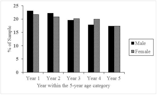 Basic descriptive statistics were used to calculate frequency counts and percentages. Differences between expected and observed counts for each of the constituent years within the five-year-age categories were examined using Chi-square goodness-of-fit tests. Finally, in cases where p < 0.05, standardised effect sizes were calculated to evaluate the magnitude of a participation-related constituent year effect for each constituent year within the five-year age category. According to the guidelines [] and in line with previous studies [], the effect size was calculated as the ratio between the observed and the expected frequency and the standard deviation.