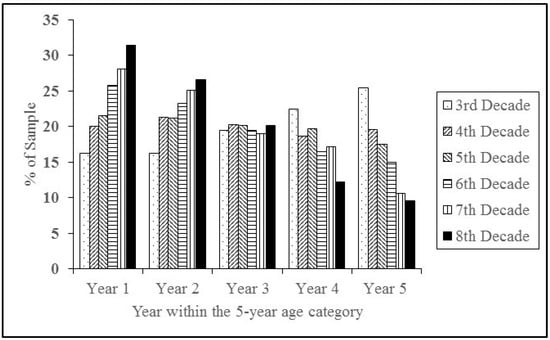 Individual ages for each competitive entry were scored as frequencies in one of five different categories ranging over five constituent years labelled from ‘Year 1’ to ‘Year 5’ (e.g. 30–34, 35–39, 40–44, 45–49, etc.). For example, individuals falling into the ‘Year 1’ category were in the first year of any five-year age category (30, 35, 40, 45, etc.). The same process was followed for ‘Year 2’ (31, 36, 41, 46, etc.), ‘Year 3’ (32, 37, 42, 47, etc.), ‘Year 4’ (33, 38, 43, 48, etc.), and ‘Year 5’ (34, 39, 44, 49, etc.). In order to examine whether a participation-related constituent year effect is influenced by age, participants were divided into age groups based on decades of life (third decade, fourth decade, etc.) as suggested by previous research [,]. Considering the small sample size of masters athletes who were in their 90s and 100s when they participated, these individuals were included in the “eighth + Decade” age group.