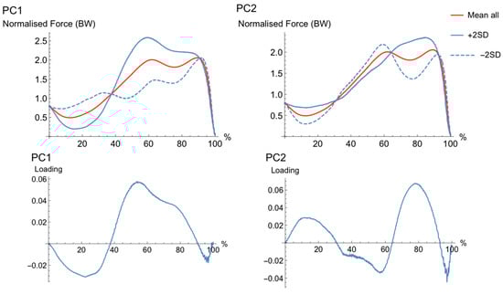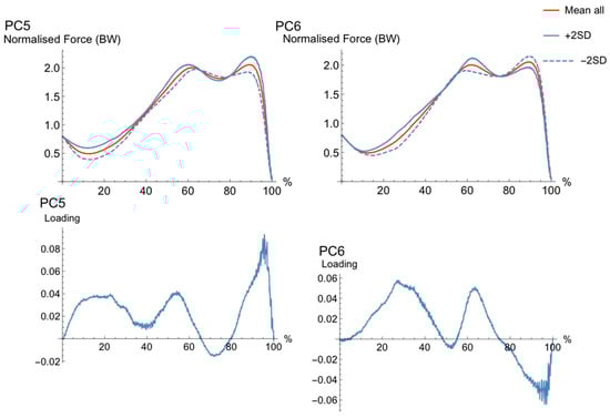 The waveforms for PC6 (Figure 3) had differences between high PC (+2SD) and low PC (−2SD) in the transition between unweighing and braking, where those with a high PC-score seem to have a slightly more accentuated unweighing and braking phases than those with a low PC-score. Furthermore, those with a high PC-score have a larger second than first peak, and the opposite for those with a low PC-score.