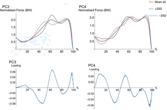 The waveforms for PC3 (Figure 2) showed a phase shift in waveforms, where the high (+2SD) PC-score showed two force peaks later in the movement cycle, with greater magnitude in the first peak when compared to the low (−2SD) PC-score. The loading vector for PC2 explained most of its variance in the waveform during the early-to-mid (35–50%), mid (60–70%), and late (95%) movement cycle. The high (+2SD) waveform had less force development earlier in the movement (35–50%) a greater magnitude in force mid-movement (60–70%) and a second peak slightly later in the movement (95%). The low (−2SD) waveform showed an earlier first and second peak, along with a lower force development during early-to-mid-cycle (35–50%) and later (90%).