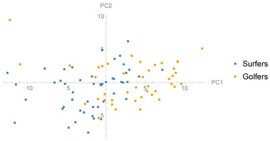 Scatter plot showing the distribution surfers and golfers in the dimensions PC1 and PC2.