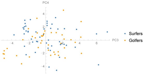 Scatter plot showing the distribution surfers and golfers in the dimensions PC3 and PC4.