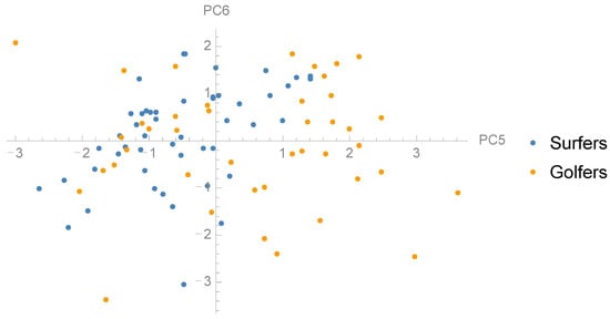 Scatter plot showing the distribution surfers and golfers in the dimensions PC5 and PC 6.