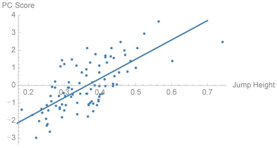 Scatter plot of the relationship between PC5 score and jump height (R2 = 0.52).