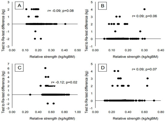 Figure 1 shows correlations for differences between tests and re-tests and relative strength for LP and BP. Despite significant or nearly entire significance, all situations presented very poor correlations.