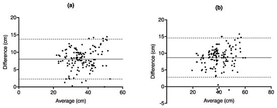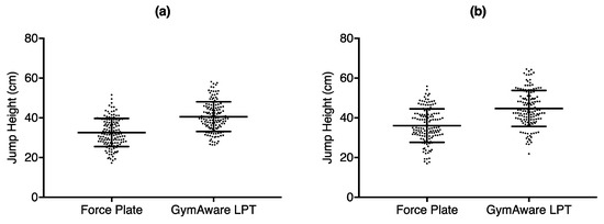 Bland–Altman difference vs. average plots depicting vertical jump height obtained from GymAware LPT—force plate vs. average of GymAware LPT and force plate for (a) squat jump height and (b) counter-movement jump height. Each point corresponds to each of the 3 jumps from each subject from both days.