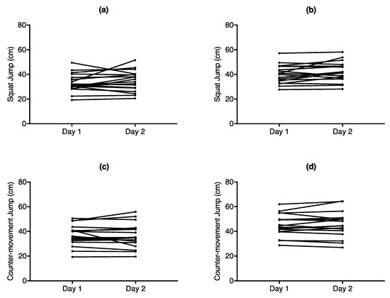 Line graphs to depict the difference of vertical jump height between days for (a) squat jump height derived from the force plate (b) squat jump height derived from the GymAware LPT (c) counter-movement jump height derived from the force plate (d) counter-movement jump height derived from the GymAware LPT. Each point corresponds to the highest of jump of returning subjects.