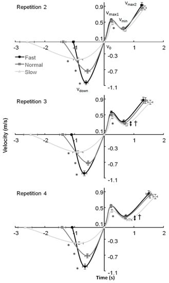 | Vmin | 0.50 ± 0.20 ↓ | 0.48 ± 0.12 ↓ | 0.59 ± 0.27 ↓ | 0.28 ± 0.15 ↓↓ | 0.25 ± 0.13 ↓ | 0.19 ± 0.08 ↓↓† | 0.17 ± 0.04 | 0.16 ± 0.02 | 0.15 ± 0.05 | |||