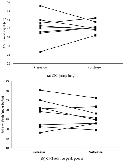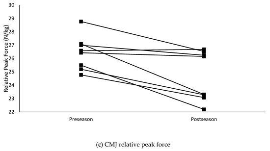 The relative peak force obtained from the CMJ significantly decreased (p < 0.001) over the course of the competitive season. Additionally, although not statistically significant (p = 0.07), the contact time during the DJ increased by 14.2%, which was a large effect. The increase in contact time and 1.89% decrease in jump height resulted in a significant (p = 0.02) 14.9% decrease in RSI. Group means for the changes in CMJ and DJ variables are presented in Table 2. Individual changes in key CMJ variables of jump height, relative peak power, and relative peak force are graphically displayed in Figure 1 while individual changes in RSI are presented in Figure 2.