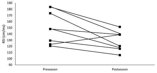 Individual changes in reactive strength index from preseason to postseason.