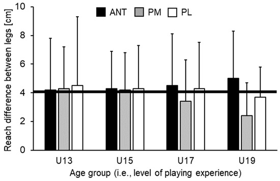 Reach distance differences (cm) between kicking (dominant) and standing (non-dominant) leg in the ANT (anterior), PM (posteromedial), and PL (posterolateral) reach directions by age group. The black solid line corresponds to reach distance differences between the standing and kicking leg of 4 cm. For the ANT direction, a reach distance difference greater than 4 cm is related to an increased risk of sustaining a lower extremity injury [7,8]. U13 = under-13 years etc.