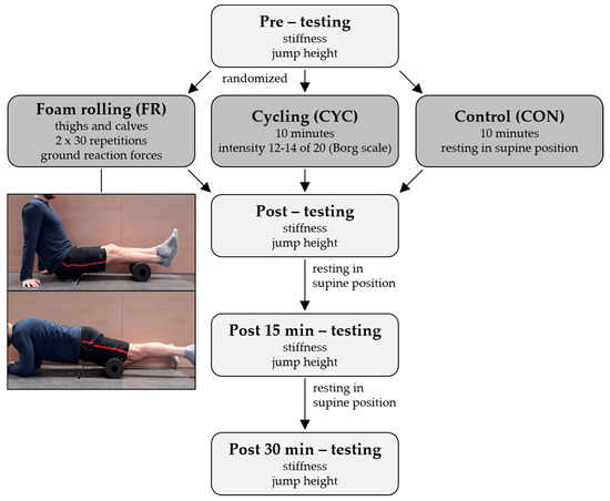 The research design of our study is summarized in Figure 1. To evaluate the biomechanical loads of two frequently conducted FR exercises, vertical ground reaction forces during rolling were measured. A randomized cross-over design was used to investigate the effects of FR on vertical jump height and muscular stiffness. Therein, the effects of FR were compared with those of ergometer cycling (CYC) and a control condition (CON). The CYC was used as a further intervention, because several studies have shown that warm-up procedures, involving ergometer cycling, enhance vertical jump performance [21,22]. This may allow for a better evaluation of the practical relevance of potentially effects after FR. The vertical jump height and muscular stiffness were assessed at the following time points: pre, post, and 15 min, as well as 30 min after each intervention. All of the interventions were performed over two weeks, with one week between each.