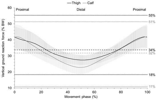 The mean vertical ground reaction force curves during the FR exercises are shown in Figure 2. Generally, the progression of the force curves were similar for the thigh and calf. The highest force values were present at the proximal position. The load decreased, when the roller device was moved distally. A mean force of 34 and 32% of the body weight were registered for the thigh and calf, respectively. The corresponding maxima of the individual force curves of the patients were 55 and 51%, respectively.