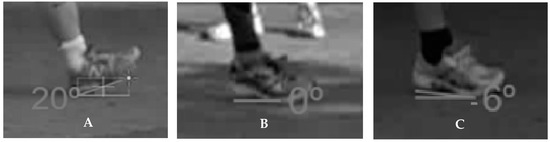 Foot-strike angle examples of rear-foot (left picture, A), mid-foot (middle picture, B), and fore-foot (right picture, C) strikes.