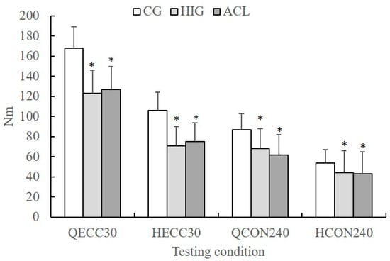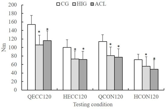 The MANOVA showed that there was a group difference in peak values (p < 0.05, η2 = 0.36, power = 0.99). The ANCOVA designs for each angular velocity condition showed a group effect on peak torque values (p < 0.05, η2 ranged from 0.23 to 0.49, power ranged from 0.87 to 0.99). The peak torque values recorded at 120°·s−1 are presented in Figure 1. In each testing condition, post-hoc Tukey tests showed that peak torque was lower in the ACL and HIG groups compared with the CG (p < 0.05). No differences between ACL and HIG were observed (p > 0.05).