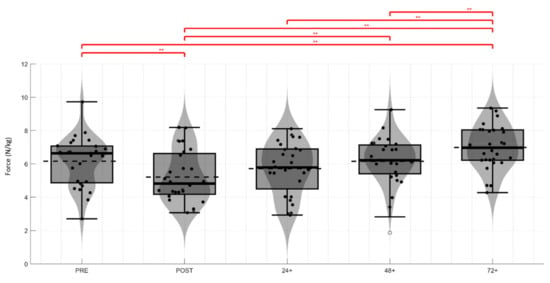 - Thorlund, J.B.; Aagaard, P.; Madsen, K. Rapid muscle force capacity changes after soccer match play. Int. J. Sports Med. 2009, 30, 273–278. [Google Scholar] [CrossRef] [PubMed]